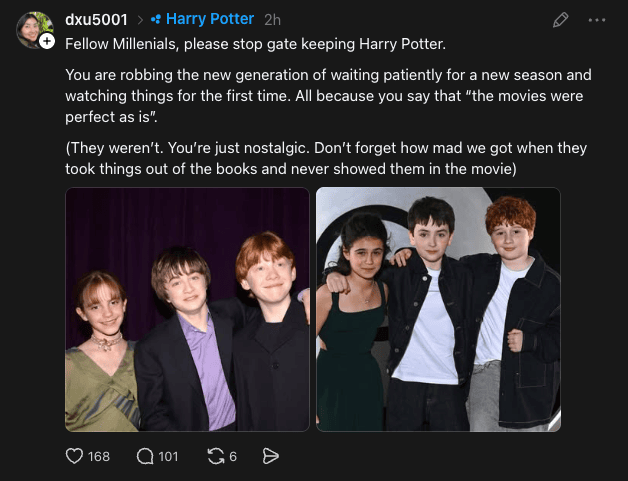 Rowling aside (as with many other authors who are being boycotted for whatever reason), why aren’t people bothering to read the books (or listen to the audiobooks) rather than wait every X number of years for studios to keep “refreshing” IP for TV or the movies? Are newer generations that lazy or too busy to spend time reading the source material now? Film, TV and theatre are not books.